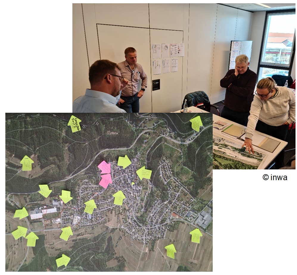 Im ersten Workshop (halber Tag) erfolgt eine gemeinsame luftbildbasierte Bestandsaufnahme. Dabei werden zentrale Wasserthemen, mögliche Schwammmaßnahmen sowie „Sowiesopotenziale“ identifiziert, also Maßnahmen, die bereits geplant sind und sich ideal mit klimaresilienten Lösungen kombinieren lassen. Alle Ergebnisse werden anschließend digital erfasst.